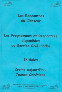Editions: Delémont: Catéchèse des adolescents du Jura pastoral, 2006 Résumé: Les rencontres du classeur : vous y trouverez différentes rencontres pour la catéchèse des adolescents. Les revues Initiales sont à emprunter aux deux COD. - Affirmation de soi (C'est mon choix) - (Célébrons nos talents) - L'amour - L'argent (Réussir sa vie) - (Questions d'argent) - (Argent, une valeur sûre ?) - (L'argent fait-il le bonheur ?) - Ce que je crois (T'y crois vraiment ?) - (Science ou foi, il faut choisir) - Confiance - De l'objet au symbole - Dépendance (Hyperconsommation) - (Conduites à risques) - (Ecrans et Cie) - Être jeune et chrétien (T'y crois vraiment ?) - (Croire) - (Dire sa foi) - (L'Eglise c'est nous) - La peur - La mort - Liberté (Prendre la route) - Mon corps (Corps vivant) - Racisme (Roms, Gitans...) - (Racismes) - Violence (Coups et blessures) - (Dieu et la violence) |