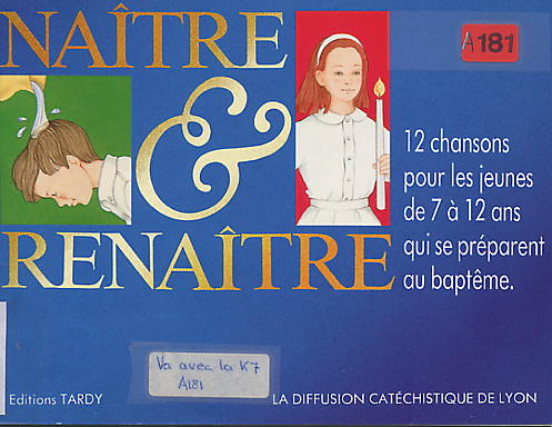 Editions: Lyon: Tardy, 1992 Résumé: NAÎTRE ET RENAÎTRE. Partitions de 12 chansons pour les jeunes de 7 à 12 ans qui se préparent au baptême: 1. Que l'Évangile nous éclaire 2. Tu m'appelles, tu me choisis 3. Soif d'amitié 4. Tu éclaires la nuit 5. Ta parole est vivante 6. Pardonne-nous aussi 7. Là où est ton trésor 8. Oui, tu renaîtras 9. Lumière du monde 10. Reçois la lumière 11. Venez plonger 12. Église qui appelle |