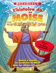 Créabible Editions: Paris: Bibli'o, 2008 Résumé: Cet album interactif contient 70 vignettes repositionnables et 5 scènes à déplier pour recréer à volonté les aventures de Moïse depuis la sortie d’Egypte jusqu’au portes de la terre promise |