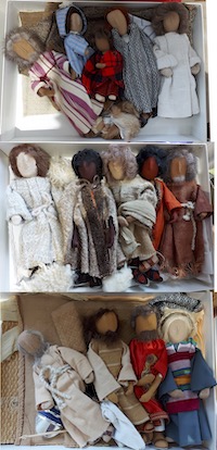 Editions: Neuchâtel: Catéchèse spécialisée du canton de Neuchâtel, 2000 Résumé: Personnages de la crèche en tissu. Les personnages mesurent en moyenne 25 cm de haut. Les visages sont sans yeux ni bouche reflétant ainsi beaucoup de douceur et de sobriété. La boîte contient : - Jésus bébé - Marie - Joseph - Une peau de lapin - 2 bergers - 3 enfants - 3 moutons - 3 mages - Siméon - Anne la prophétesse |