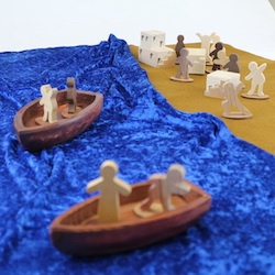 Gott im Spiel Editions: Leipzig (D): Diakonie Lindenwerkstätten, 2024 Résumé: L’appel des premiers disciples est également rapporté en Mathieu 4,18-22 et Marc 1,16-20. Mais ici, contrairement à ces passages, les pêcheurs ne suivent pas Jésus simplement parce qu'il les y invite, mais en raison de leur rencontre avec le divin. Avec la pêche miraculeuse, Pierre et les autres pêcheurs reconnaissent en Jésus une autorité qui vient de Dieu, devant laquelle ils s’inclinent et par laquelle ils deviennent disciples. Le fait de suivre Jésus ne s’arrête pas aux disciples mais débouche sur la mission. L’approche Gott im Spiel, deìveloppeìe en Allemagne, a les mêmes principes et objectifs que Godly Play, la même approche œcumeìnique et inclusive de l’accompagnement spirituel des enfants. Alors que Godly Play a une vision christologique haute et solennelle, Gott im Spiel met l’accent sur les rencontres humaines de Jeìsus incarneì dans le monde. Contenu de la boîte : - fond en feutrine brun moyen (env. 90 x 45 cm) - Panne de velours bleu profond (env. 75 x 100 cm) - 2 barques, d'aspect ancien et plats - 3 petites maisons avec un escalier latéral et des fenêtres, pour la ville de Capharnaüm. - 1 boîte carrée en carton contenant : 12 figurines du peuple de Dieu sur pieds et 1 figurine de Jésus. - Le tout est présenté sur un petit plateau en bois. |