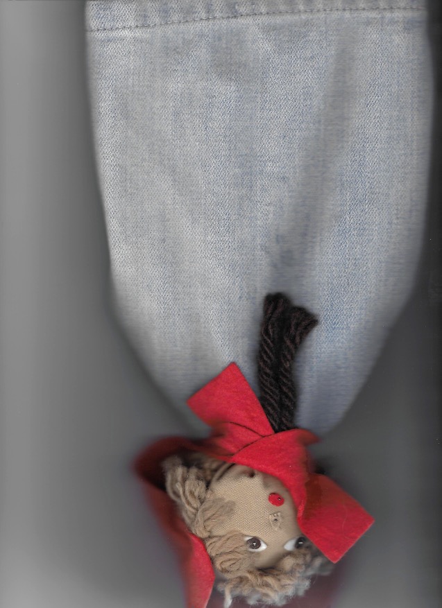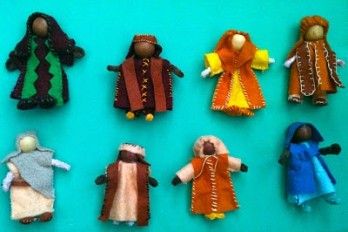 Marionnette Tunique vert et or. Chapeau rouge et vert.
